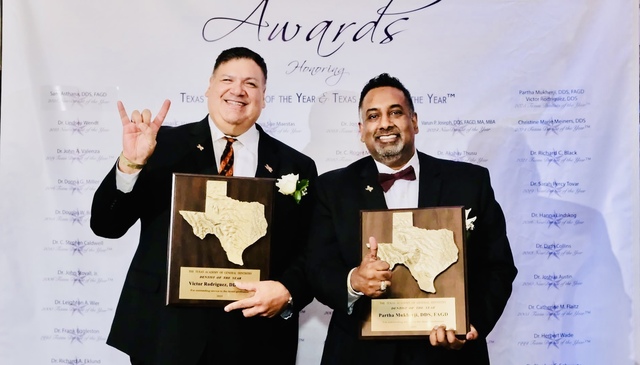 That dedication was saluted recently in Austin as Mukherji and his longtime friend, Dr. Victor Rodriguez of Houston, owner of a dental practice in Houston and an adjunct professor at UTHealth Houston School of Dentistry, were named co-recipients of 2025 Texas Dentist of the Year at Texas Academy Awards, Texas Academy of General Dentistry’s celebratory event. Each was honored for service to his community and the dental profession, commitment to continuing education, leadership and professional excellence.